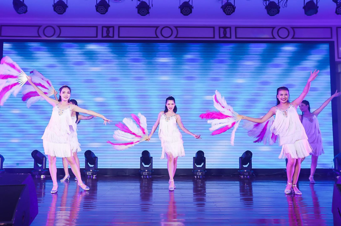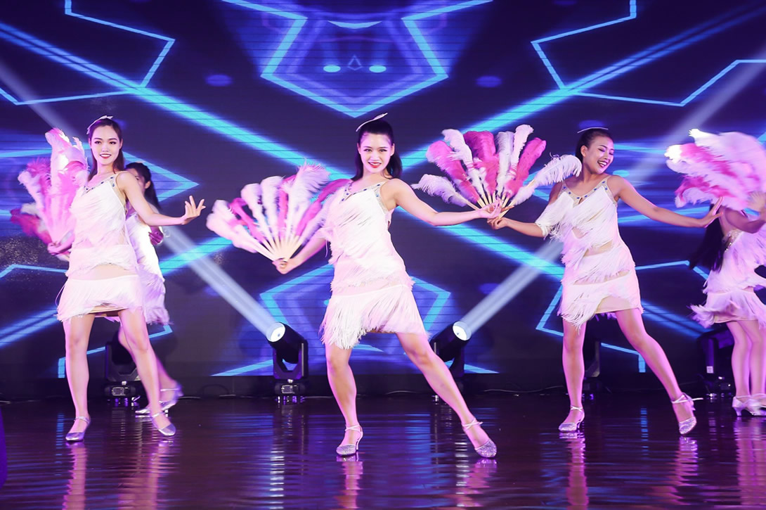 复古、热情、气氛活跃、异国风情 打羽毛扇为道具,背景音乐欢快,节奏鲜明,服装夺目,形式新颖的大气舞蹈。